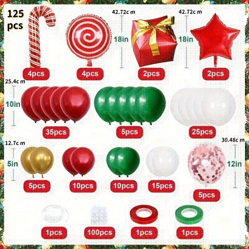 - Contient: 125 pièces, incluant ballons rouges, verts, dorés, blancs, cannes à sucre gonflables et ballons en forme de cadeau.