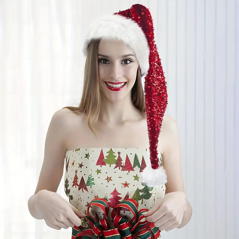 Ce bonnet de Noël est parfait pour compléter vos déguisements de Noël. Avec ses paillettes rouges scintillantes et sa fausse fourrure, il attire tous les regards et crée une ambiance festive lors de vos célébrations.