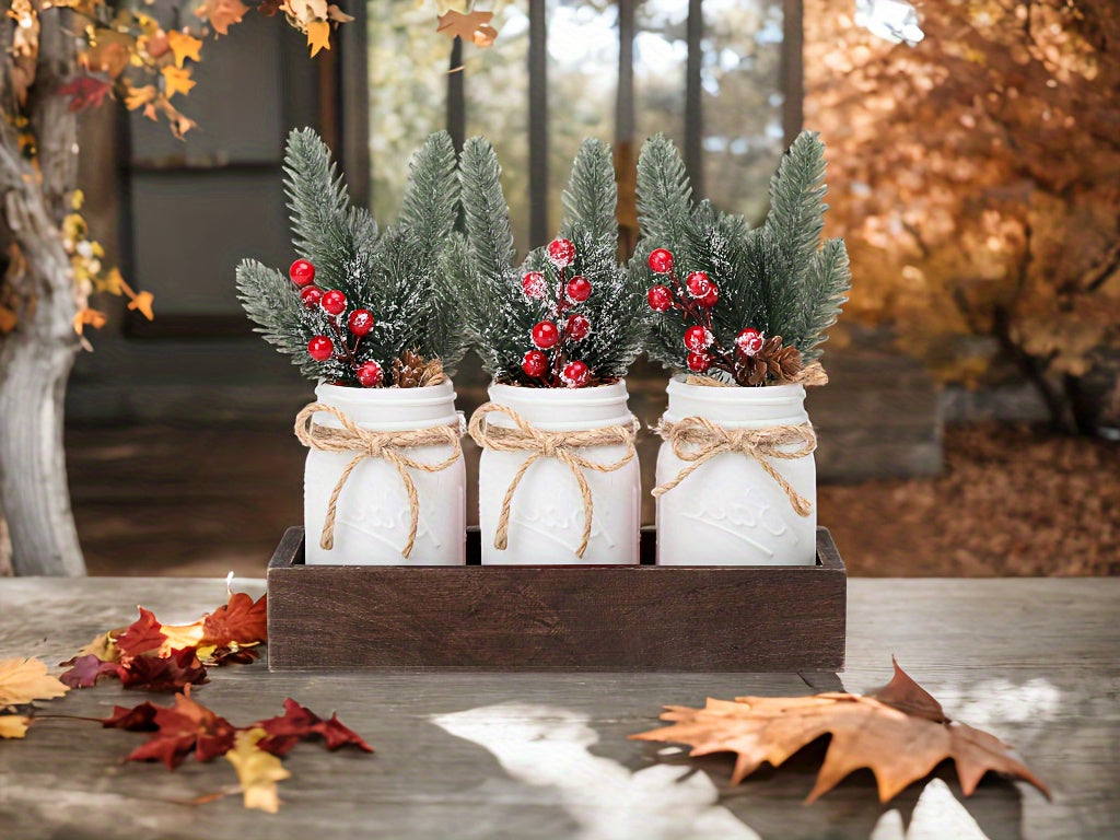 Matériau: Pots en verre avec décorations en corde naturelle, ornés de conifères artificiels pour un style Noël authentique.