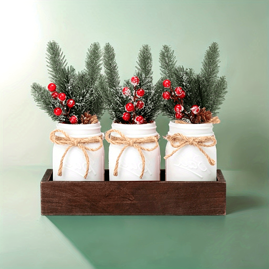 Contient: Ensemble de trois pots avec branches de conifères enneigées, baies rouges et support en bois.
