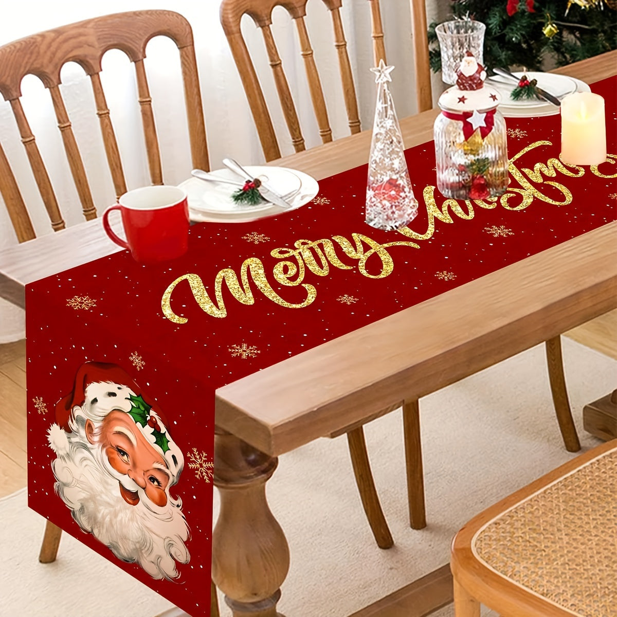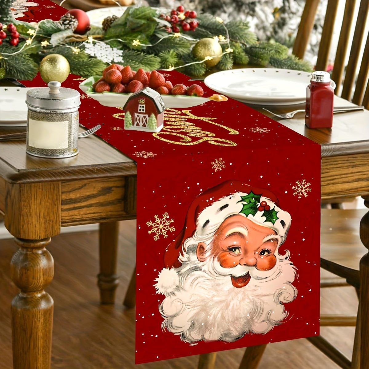 - Composition: Chemin de table avec un motif de Père Noël accompagné de flocons de neige et de touches dorées pour un look festif.