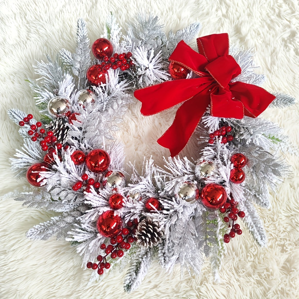 - Matériau: Fabriquée en branches de sapin artificielles, ornée de flocons givrés et ornements rouges.