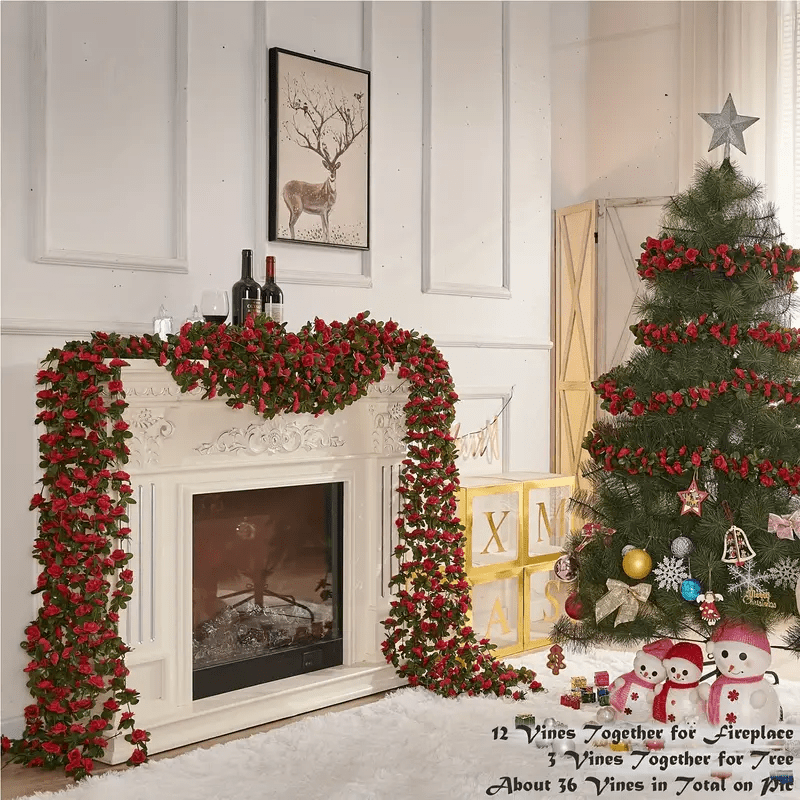 La guirlande de fleurs de Noël est conçue pour ajouter une touche de sophistication à chaque intérieur. Les roses rouges se marient parfaitement avec des accessoires lumineux, créant une décoration de Noël traditionnelle.
