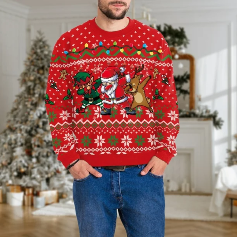Avec sa coupe loose et son col ras du cou, ce pull de Noël homme combine confort et style. Fabriqué en 95% polyester et 5% spandex, il est à la fois léger et résistant. Son tissu en maille procure une chaleur agréable, tandis que ses motifs de Noël ajoutent une touche d’humour à votre tenue, idéale pour les festivités de Noel.
