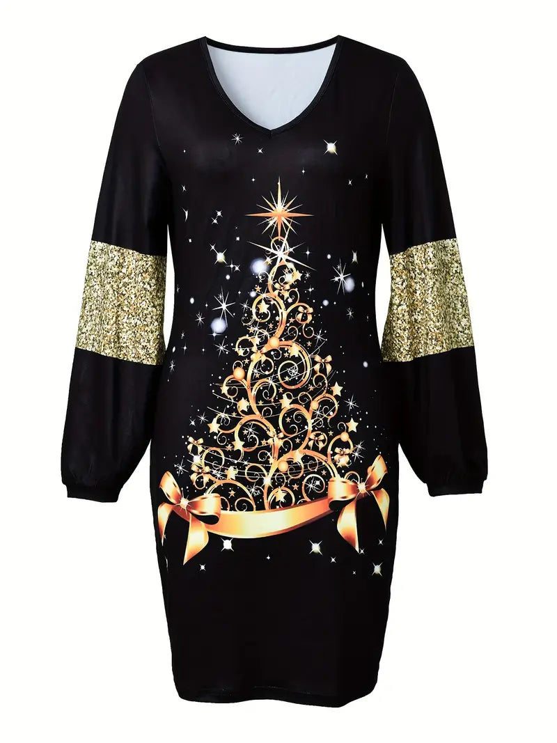 Cette Robe de Noel Élégante avec Manches Pailletées en 95% polyester, 5% spandex vous enveloppe d'élégance avec ses motifs de Noël et son col en V flatteur. Son tissu en maille légèrement extensible la rend idéale pour vos fêtes, tout en étant lavable en machine.
