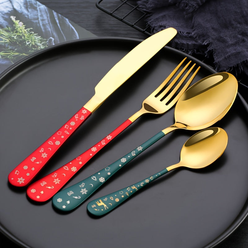 - Motifs: Motifs de flocons de neige, rennes et sapins, ajoutant une touche festive et élégante à chaque ustensile.