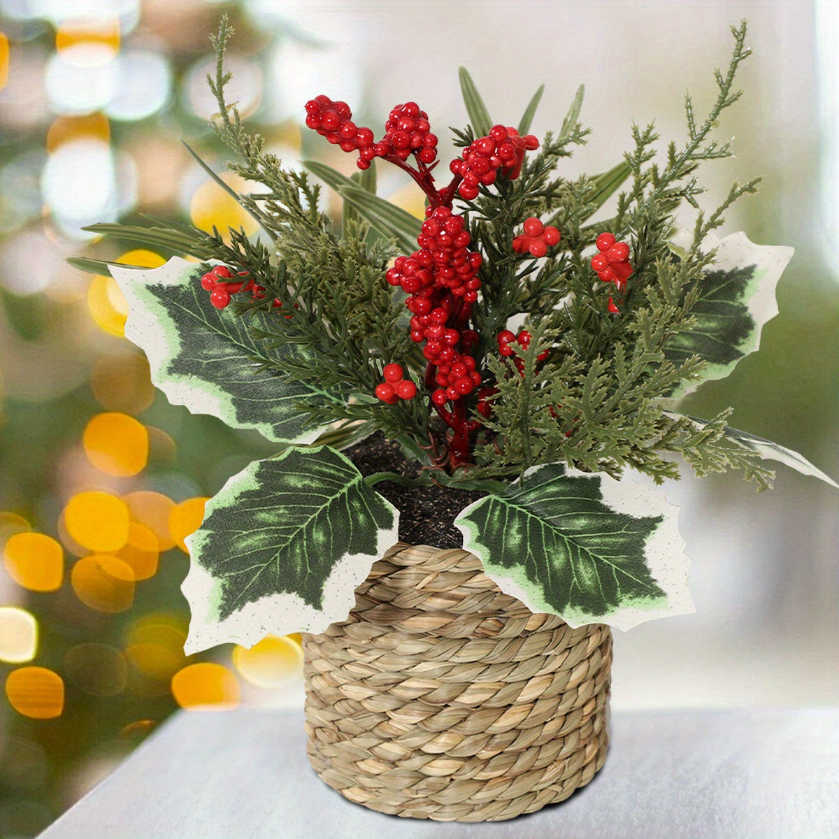 - Motifs: Arrangement avec des baies rouges brillantes, des branches de pin réalistes et des feuilles de houx, parfait pour Noël.