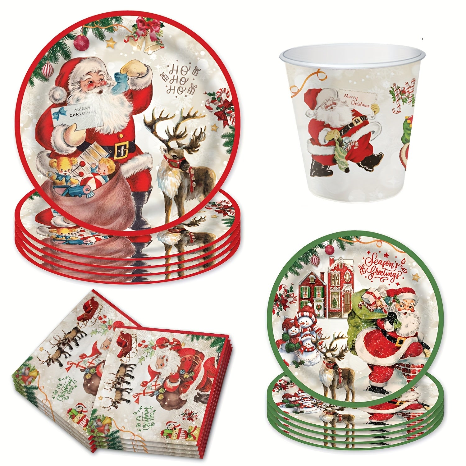 - Composition: Ensemble complet comprenant assiettes, gobelets, et serviettes assortis, parfait pour tous vos repas de Noël.